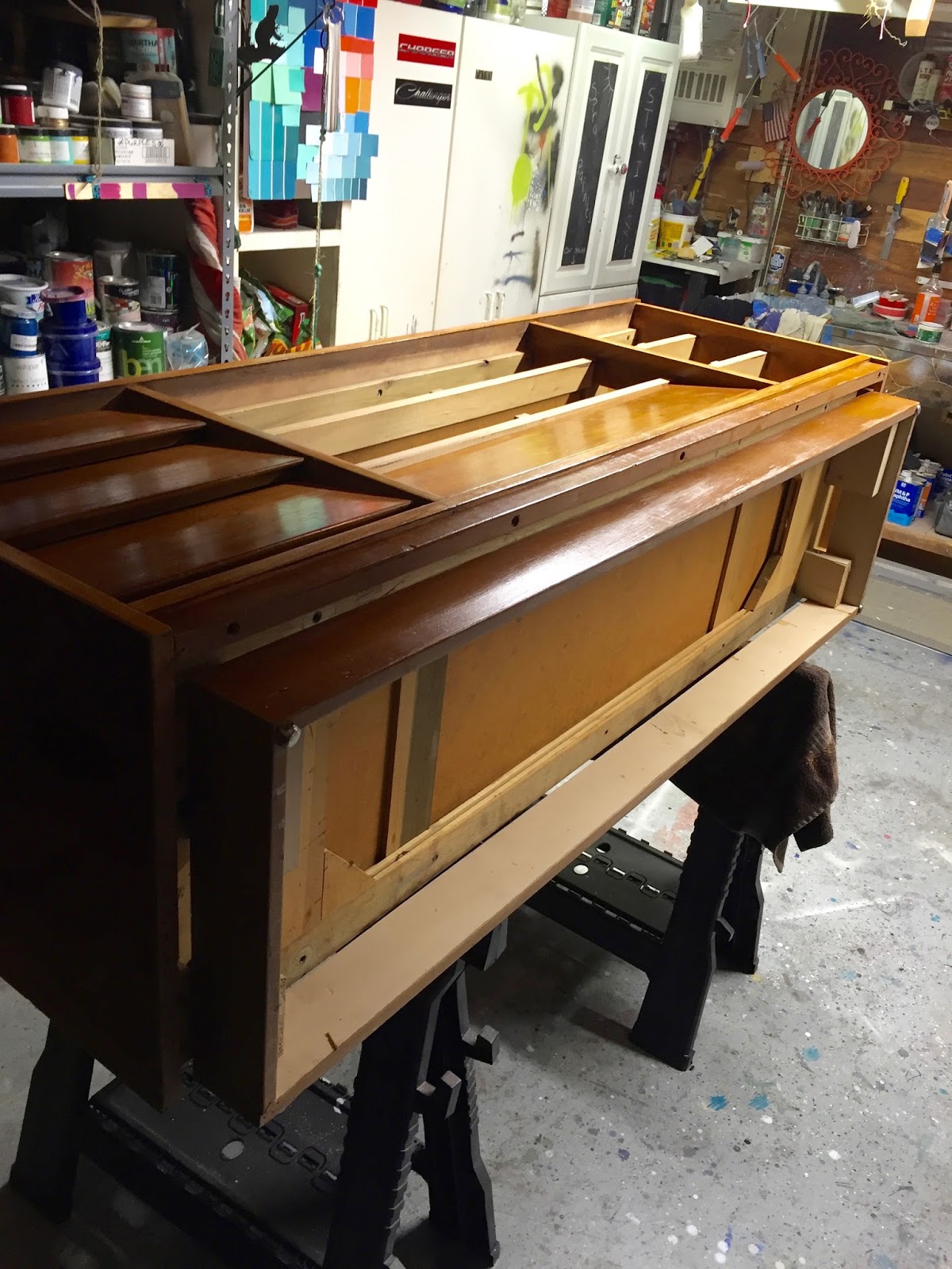 I just love doing the mid century dressers and credenzas. For this one I used Fine Paints of Europe, Eco line. This is an acrylic/oil hybrid that is water based. The pigments in this paint are so rich and deep, they literally pop! For this piece I picked a gorgeous chartreuse. Now, this isn't a color that everyone can use, but I don't think it overwhelms the piece and will go with any gray, black/white decor. It's an accent piece. When I picked it up, someone had already taken off the legs and built some sort of base for it to sit on. It came to mid thigh level! I asked the owner, "Where's the rest of it??:"